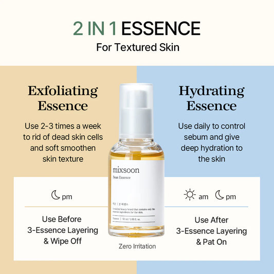 Serum<div><strong data-mce-fragment="1">[AMAZON BESTSELLER]</strong></div> <div> <strong data-mce-fragment="1">mixsoon Signature Bean Essence ranked TOP 5 on Amazon for facial serumsΒ </strong><span data-mce-fragment="1"><strong data-mce-fragment="1"></strong></span><span data-mce-fragment="1"><strong data-mce-fragment="1"></strong></span><span data-mce-fragment="1"><strong data-mce-fragment="1"></strong></span> </div> <ul> <li><span>Bean Essence is a gentle essence, best for exfoliating and hydrating textured skin with zero skin irritation.</span></li> <li>Strengthens skin health, moisturizes & revitalizes skin tone, exfoliates & smooths skin texture, and provides natural antioxidants rich in vitamin C&E.</li> <li>Vegan & cruelty-free. Free from alcohol and artificial fragrance.<br> </li> <li class="a-spacing-mini"><span class="a-list-item">Key ingredients: Fermented bean, barley, pomegranate, and Korean pear</span></li> </ul>